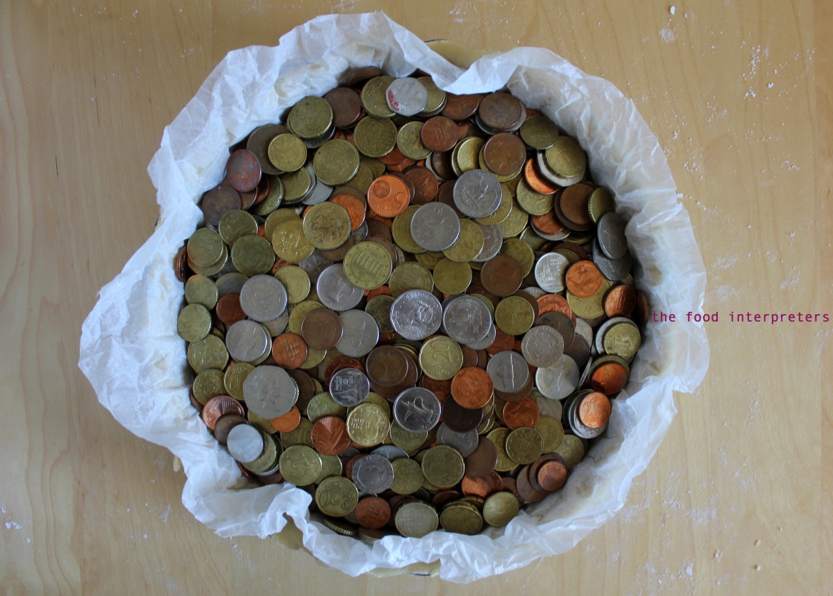 Line the tart with baking paper and fill with beans (…or coins) and bake for 15 minutes. Remove the baking paper and beans (or coins) and bake for a further 10 to 15 minutes, until the base is dry and lightly golden.