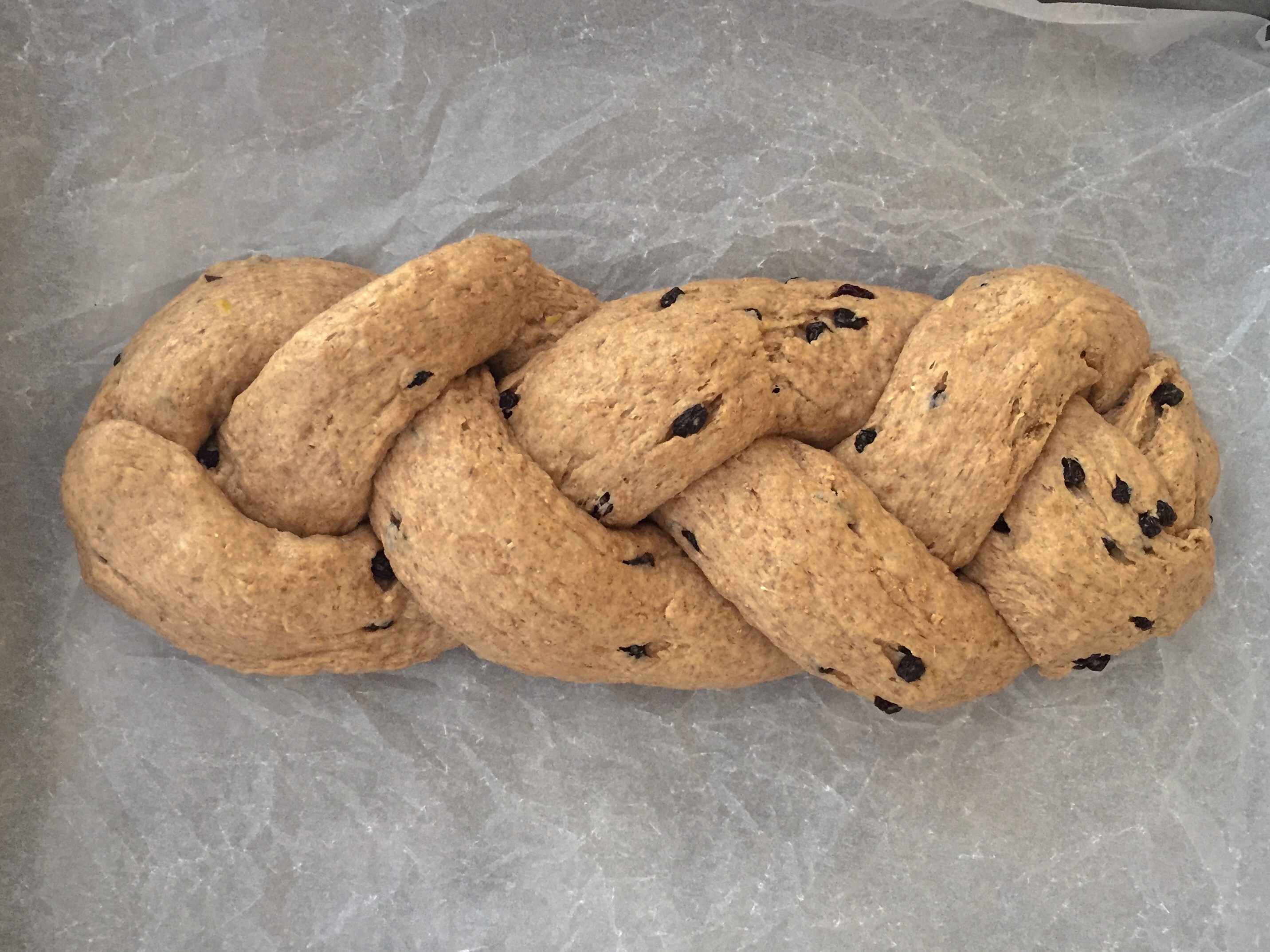 Divide the risen dough into 3 balls roll each into strips 35-38 cm long and about 4-5 cm in diameter. Lay the three strips side by side, pinching together at one end, and braid. Pinch together at the other end to hold the loaf intact.